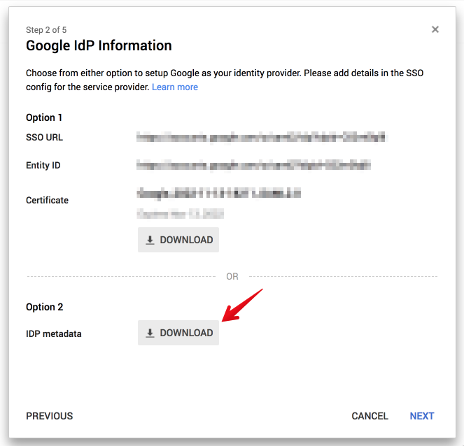 Use Option 2 to download the IdP metadata, and copy and paste for later use in Split.